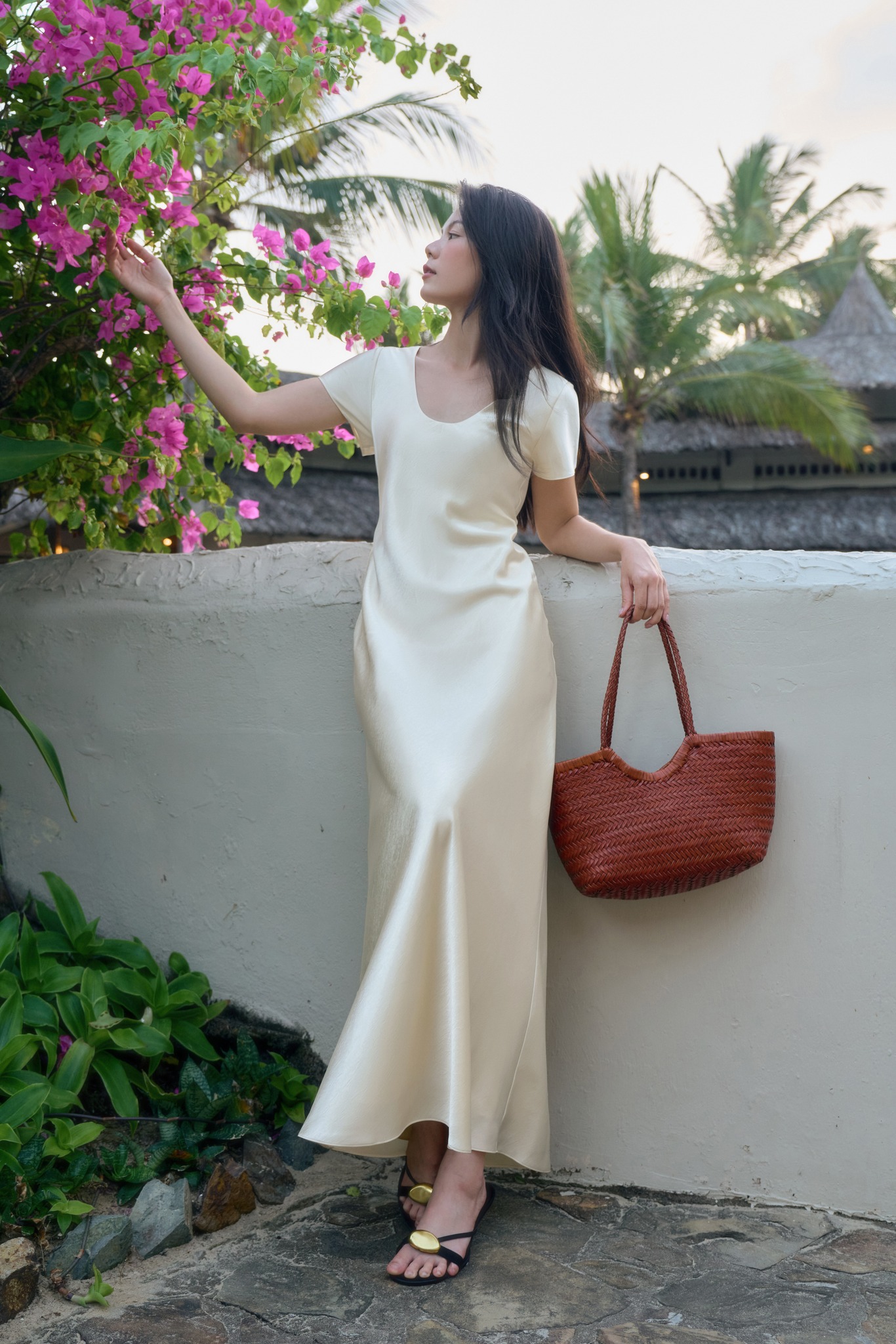 Đầm lụa đuôi cá dáng dài màu kem với phần cổ chữ U thanh thoát, đường cắt cong nhẹ tôn dáng. Chất vải lụa tổng hợp nhẹ, có bề mặt bóng, ít nhàu, nhanh khô và ít bám bụi nên thuận tiện mang theo trong những chuyến đi biển mùa hè. ẢNH: MAUVE