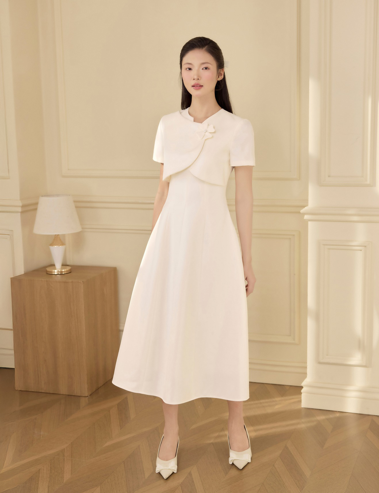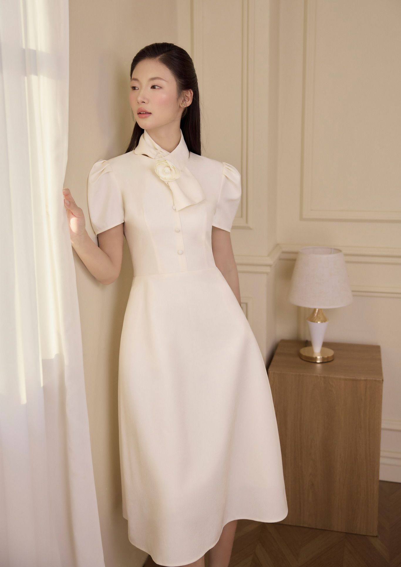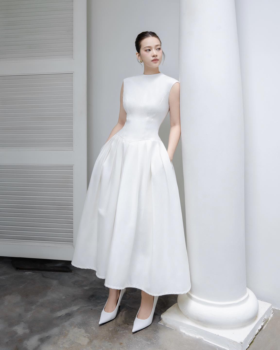 Váy chữ A gam màu trắng kem nhã nhặn và lịch thiệp. Chi tiết cách điệu trên phần vai cổ khéo léo tạo ra điểm nhấn thu hút duyên dáng cho nàng. ẢNH: JM