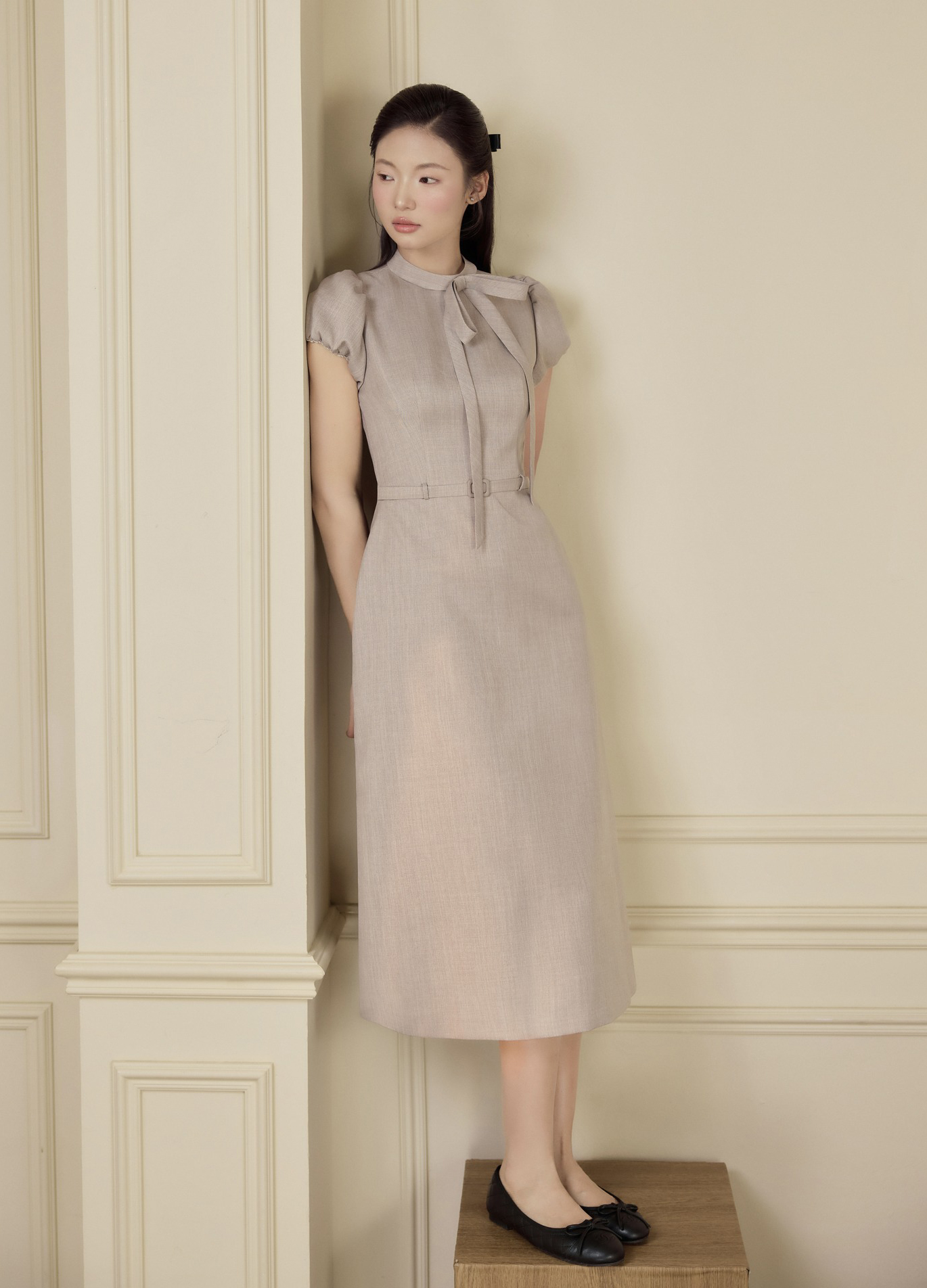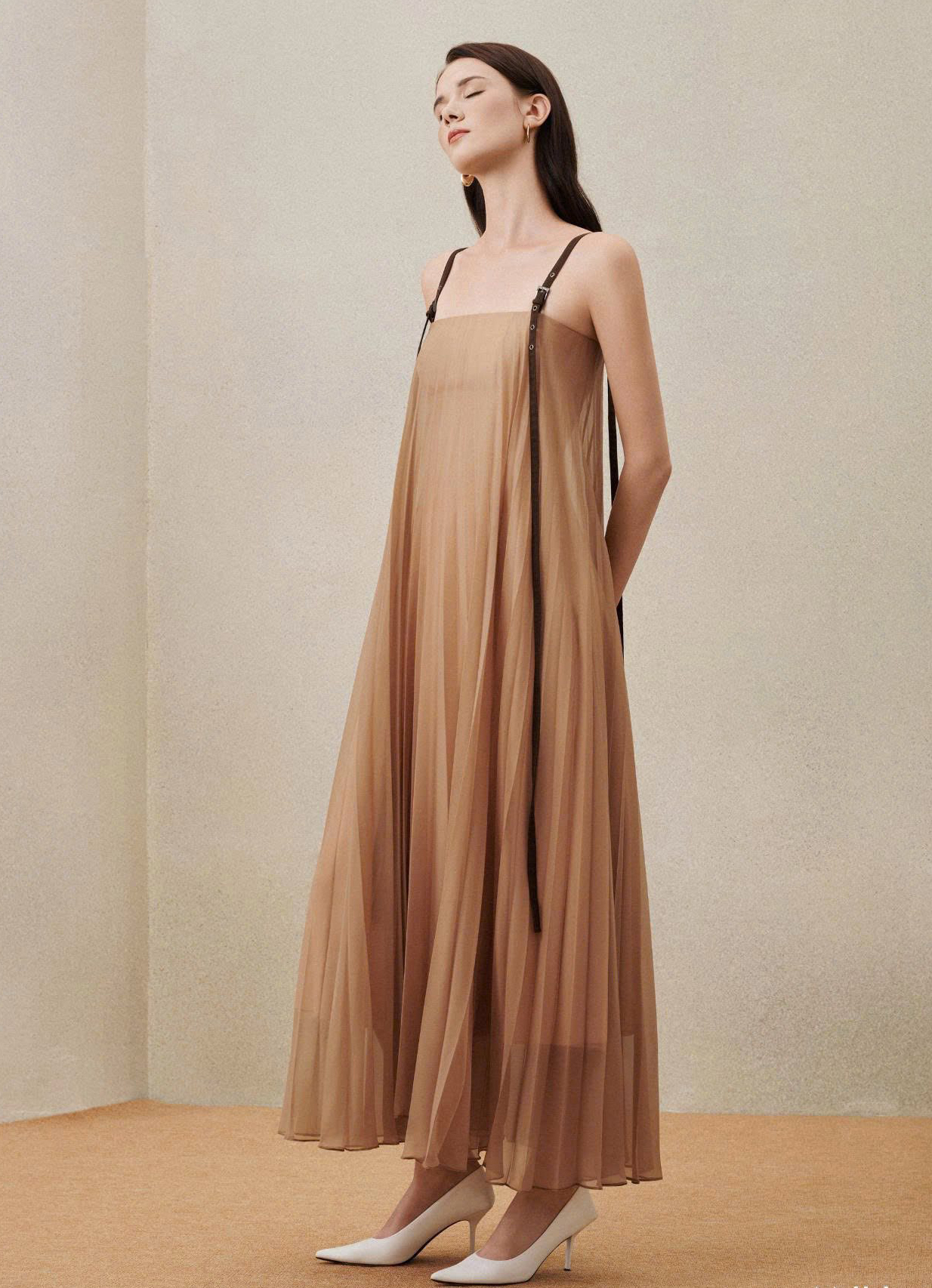 Đầm suông xếp ly mang đến dáng vẻ thư thái thả lỏng, tông nâu beige có thể phù hợp với rất nhiều tông màu da khác nhau. ẢNH: ANH CLOTHES
