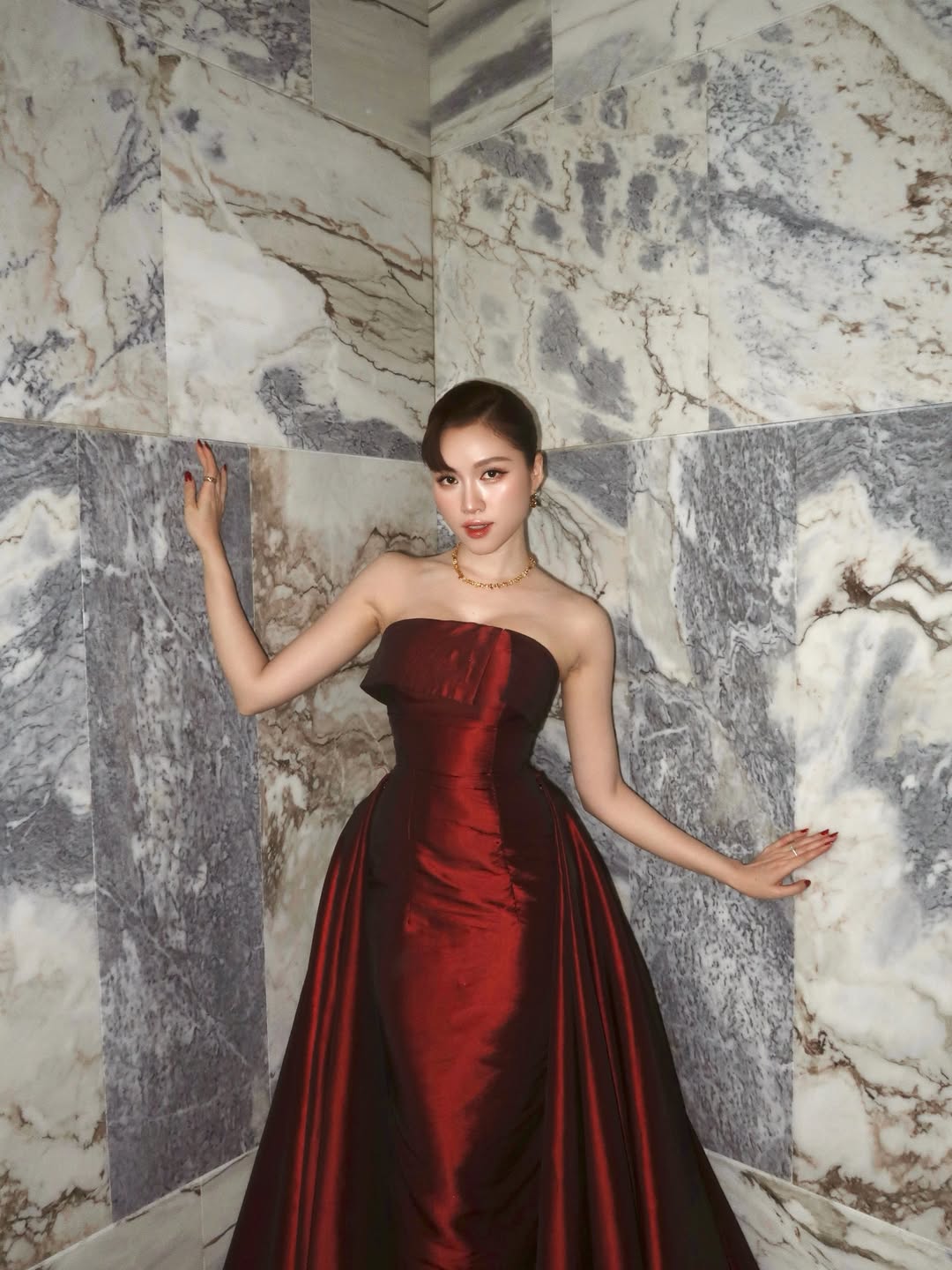 Chiếc váy dạ hội đỏ đậm mang sắc thái burgundy sang trọng là lựa chọn hoàn hảo để nàng tỏa sáng. Gam đỏ trầm quyền lực kết hợp chất liệu lụa satin bóng nhẹ tạo hiệu ứng bắt sáng tinh tế, vừa tôn lên vẻ mềm mại nữ tính vừa giữ được khí chất quý phái. ẢNH: @MCTHANHTHANHHUYEN