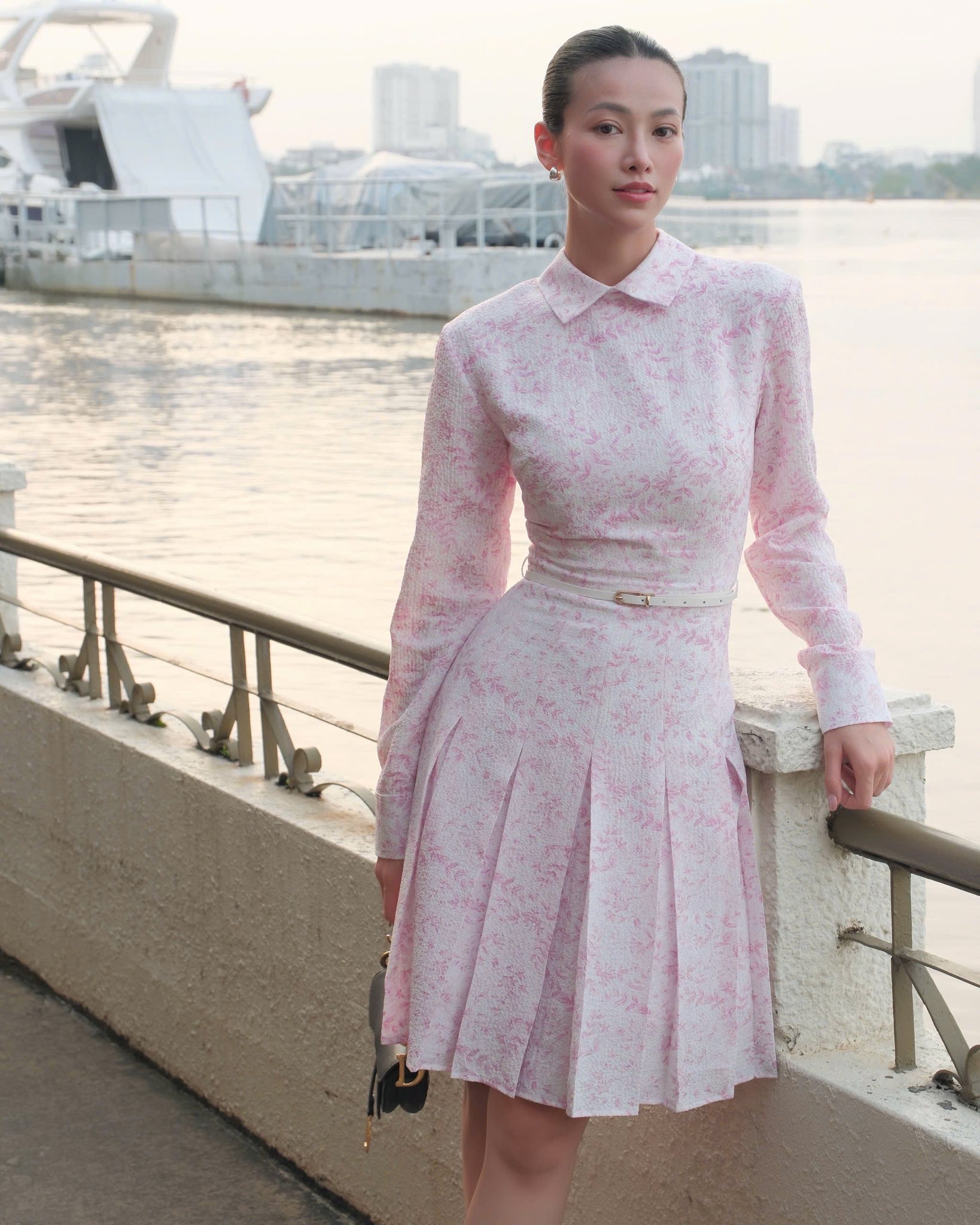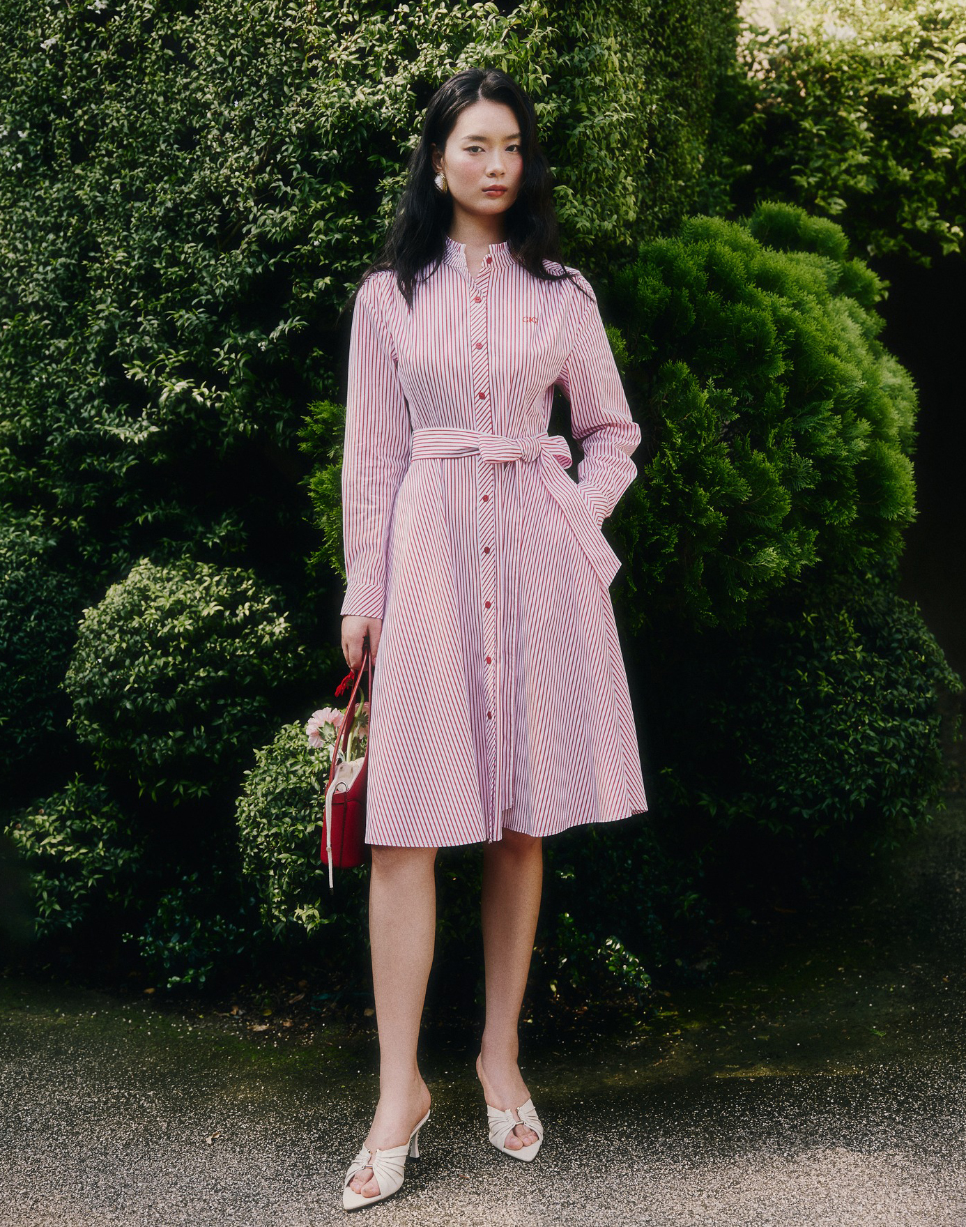 Đầm sơ mi họa tiết kẻ sọc dọc trên nền vải hồng mang đến hình ảnh hiện đại, năng động và giàu sức sống. ẢNH: GIGI