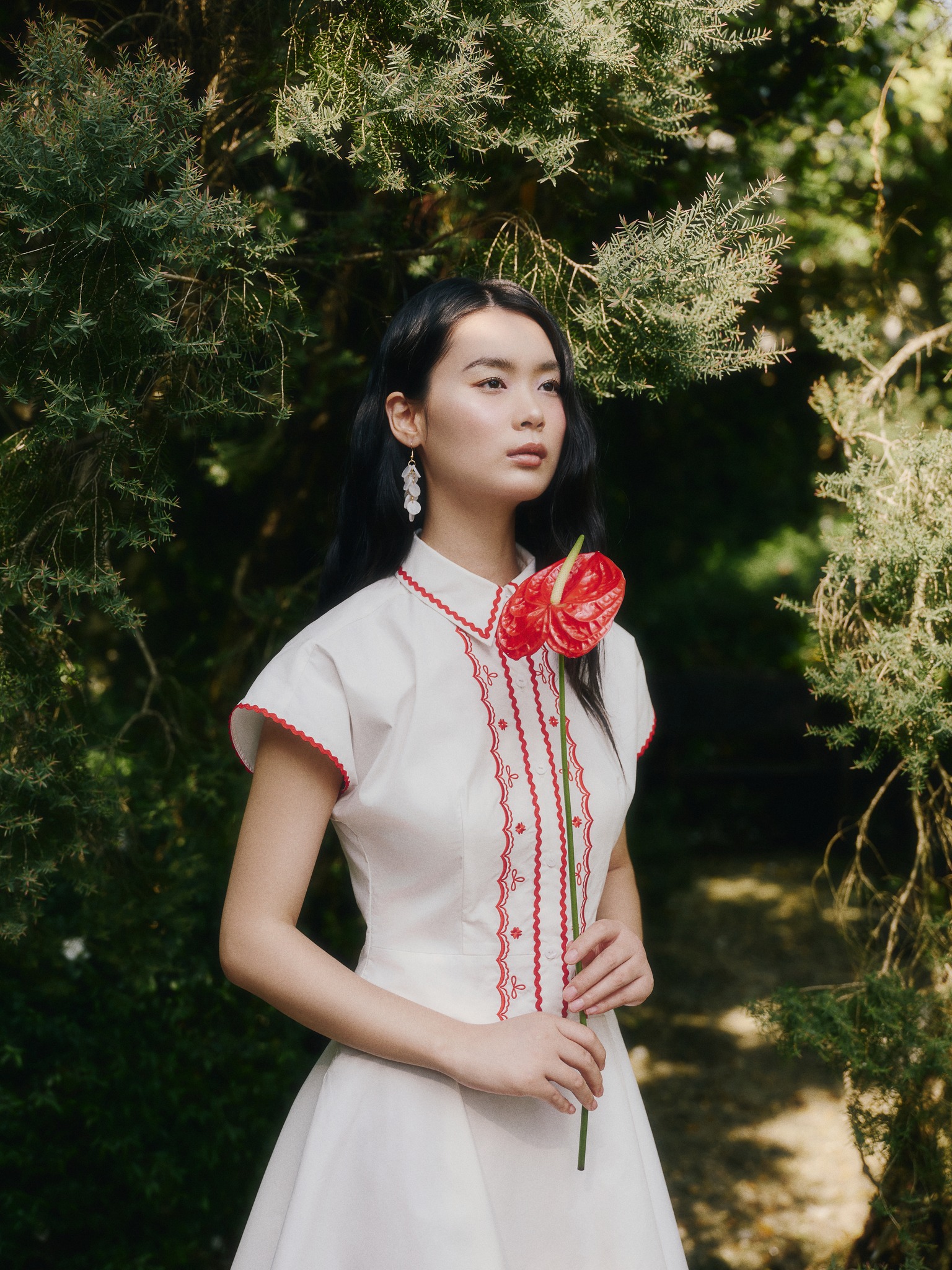 Chìm đắm trong cảm xúc lãng mạn ngọt ngào qua những thiết kế váy liền tinh tế, thu hút mọi ánh nhìn. Điểm nhấn của mẫu trang phục này chính là họa tiết thêu viền chạy dọc theo các phần nẹp cổ áo, tay và thân trước; hai gam màu đỏ và trắng tương phản, nổi bật và giúp nàng thu hút mọi ánh nhìn. ẢNH: GIGI