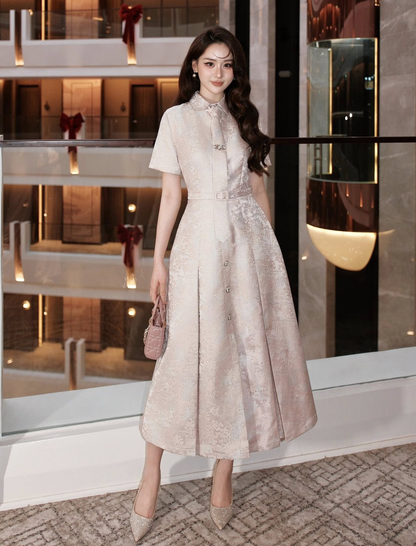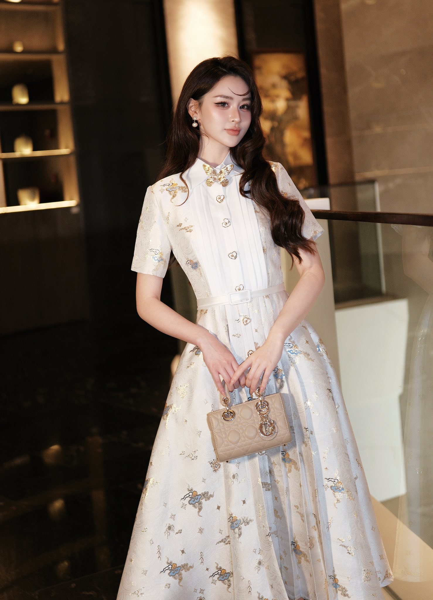 Chất liệu gấm dệt họa tiết, tafta... vừa đứng phom vừa óng ả bắt sáng nên được đặc biệt yêu thích diện trên thảm đỏ, diện trong những sự kiện trang trọng. Mẫu đầm dáng dài xếp ly dọc, kết hợp thêm hàng cúc mạ và cài áo cánh bướm mang đến diện mạo quý phái, rạng ngời. ẢNH: WHITE PLAN