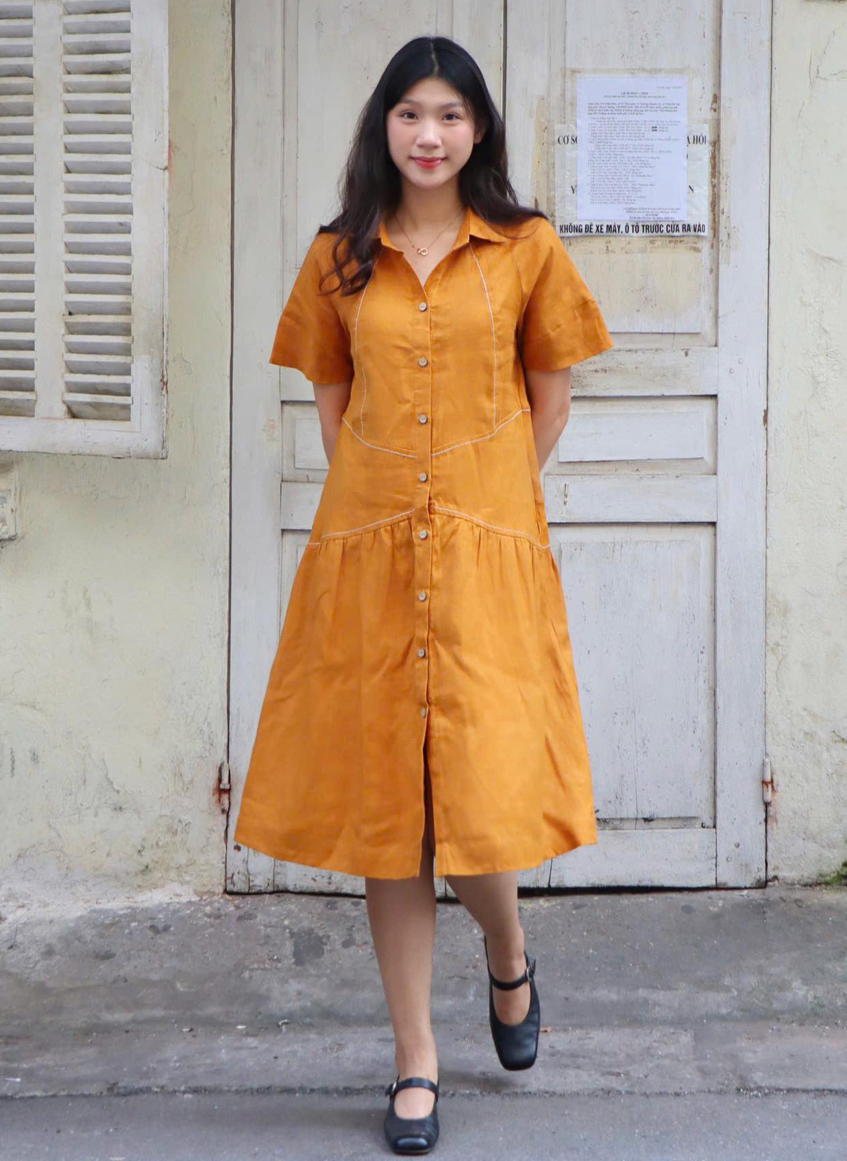 Chi tiết cổ phối ren, phối vải khác màu, dây đai buộc eo thắt nơ... góp phần làm cho mỗi chiếc váy sơ mi trở nên nữ tính hơn. Quý cô có thể diện xăng đan, giày cao gót, Mary Jane, mules... cho kiểu đầm cổ điển này. ẢNH: OYSTER