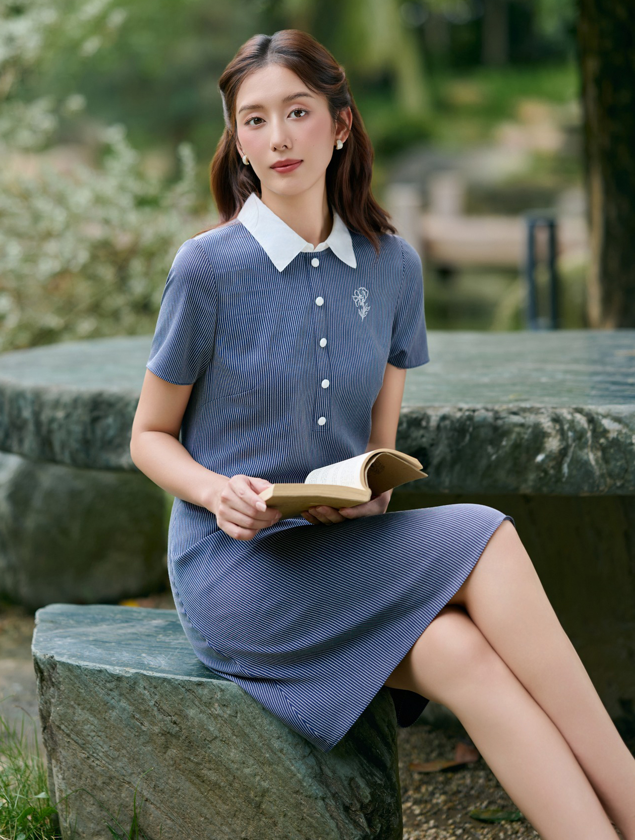Váy sơ mi kẻ sọc trở nên duyên dáng và nữ tính bội phần nhờ vào những chi tiết cách tân hiện đại như khuy cài mạ màu vàng gold nổi bật, vạt xếp lớp hay tận dụng họa tiết kẻ làm điểm nhấn cho phần đai eo. ẢNH: ESTRANO CHIC