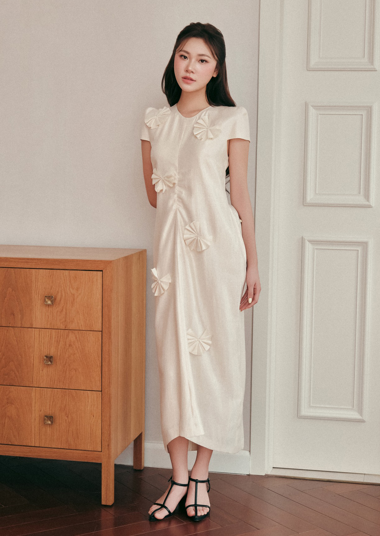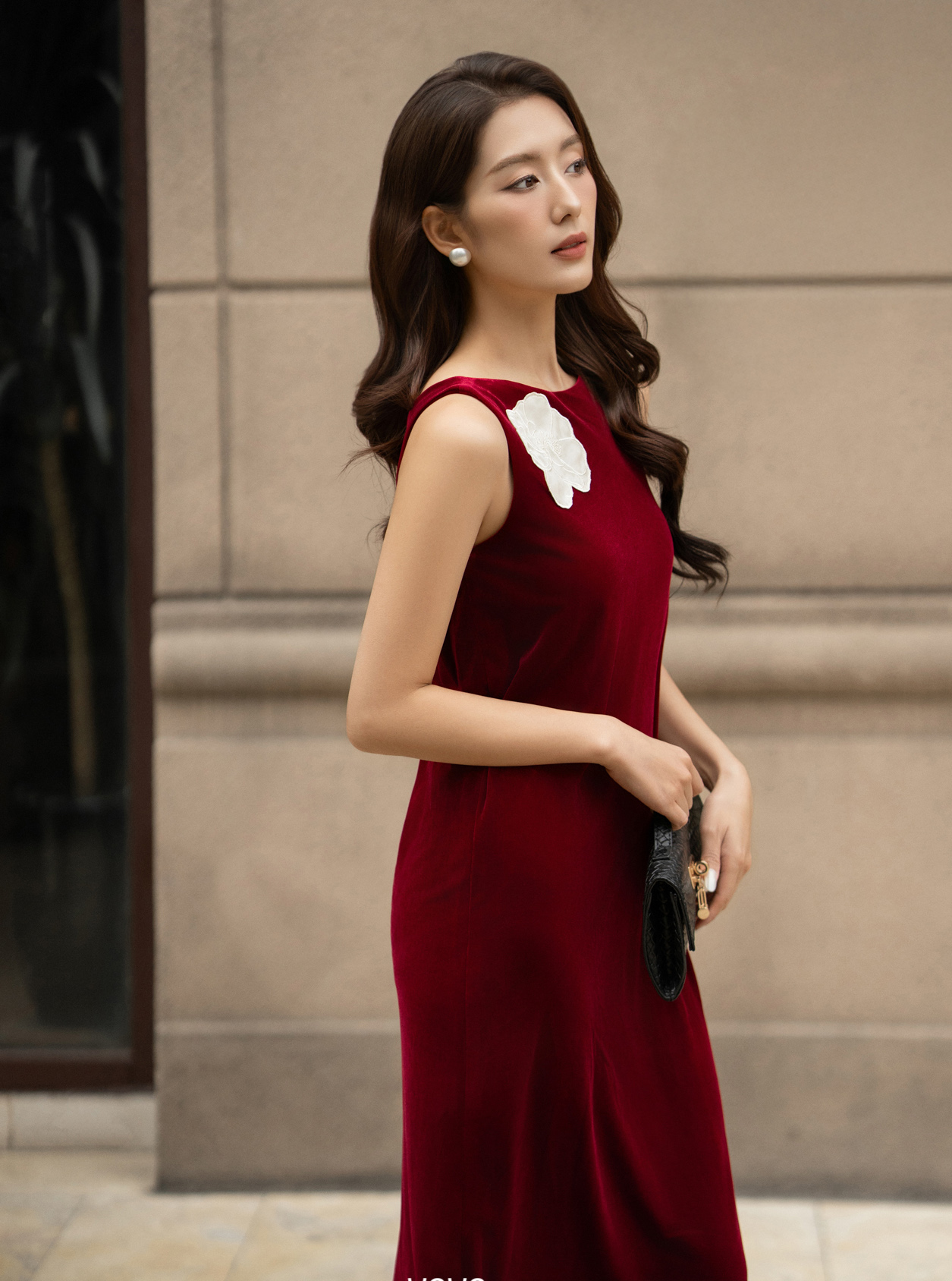 Đầm dài màu đỏ rượu chất liệu nhung mang đến vẻ rực rỡ, cuốn hút theo cách thật tự nhiên mà khó có thể cưỡng lại. Thiết kế khéo léo điểm chi tiết hoa trắng trên vai tạo điểm nhấn thị giác cho trang phục thêm phần xuất sắc. ẢNH: XAXA