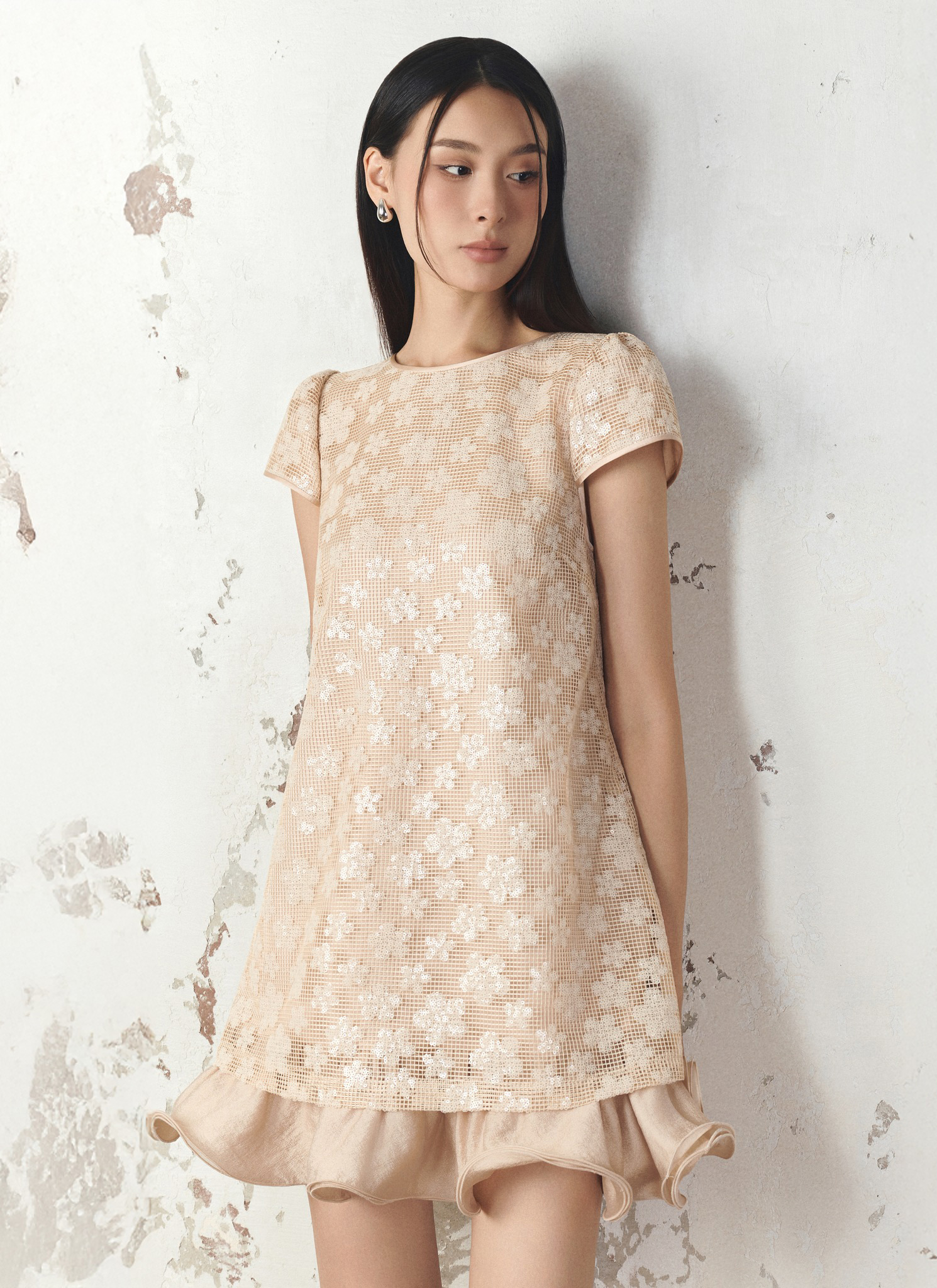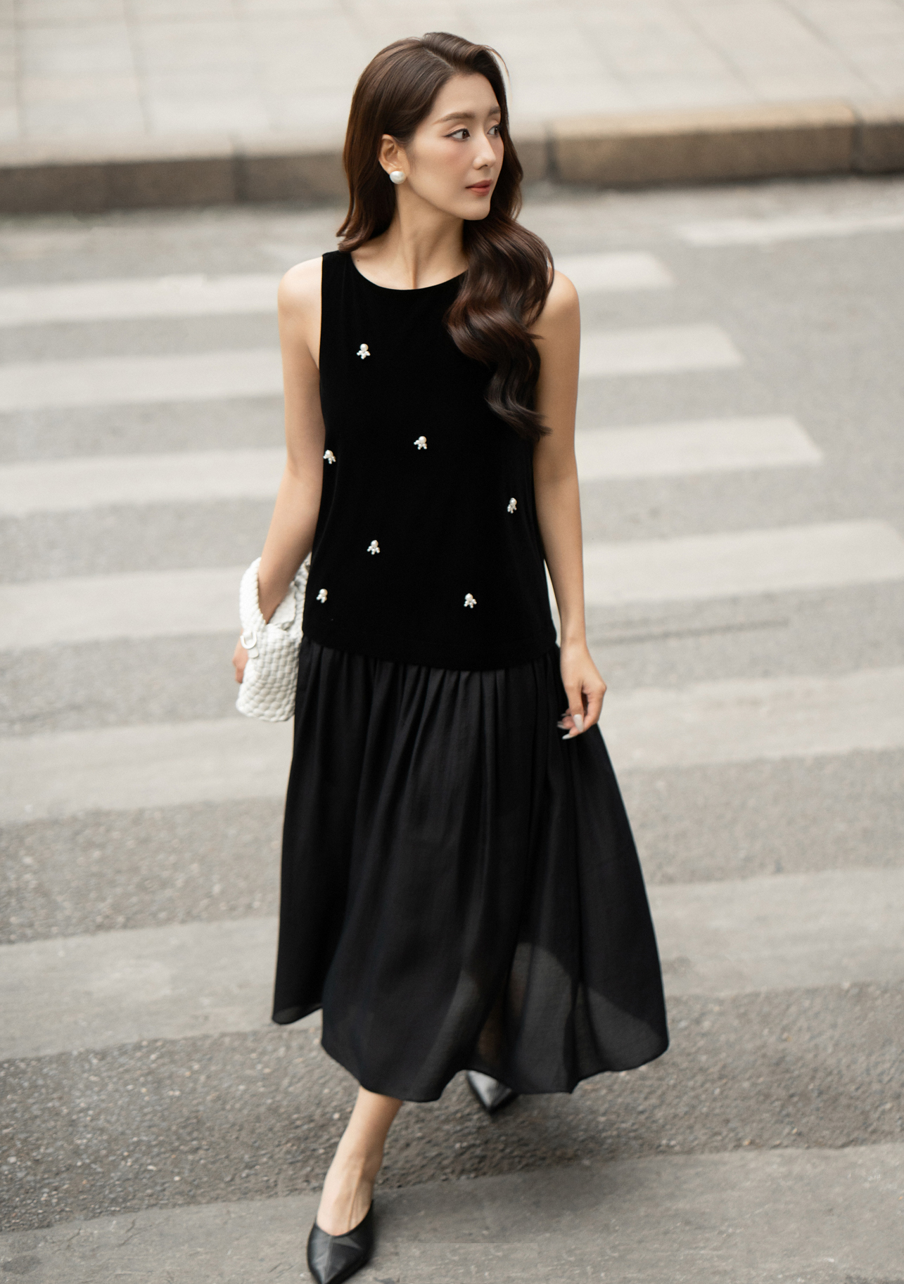 Vẻ đẹp sang trọng thầm lặng của nhung đen được chuyển tải qua thiết kế đầm phom suông quý phái mà tinh giản. Từng hạt ngọc trai nhỏ đính lấp lánh nổi bật trên nền vải, mang đến diện mạo đặc trưng đại diện cho phong cách đẳng cấp và sức hút vượt thời gian., ẢNH: XAXA