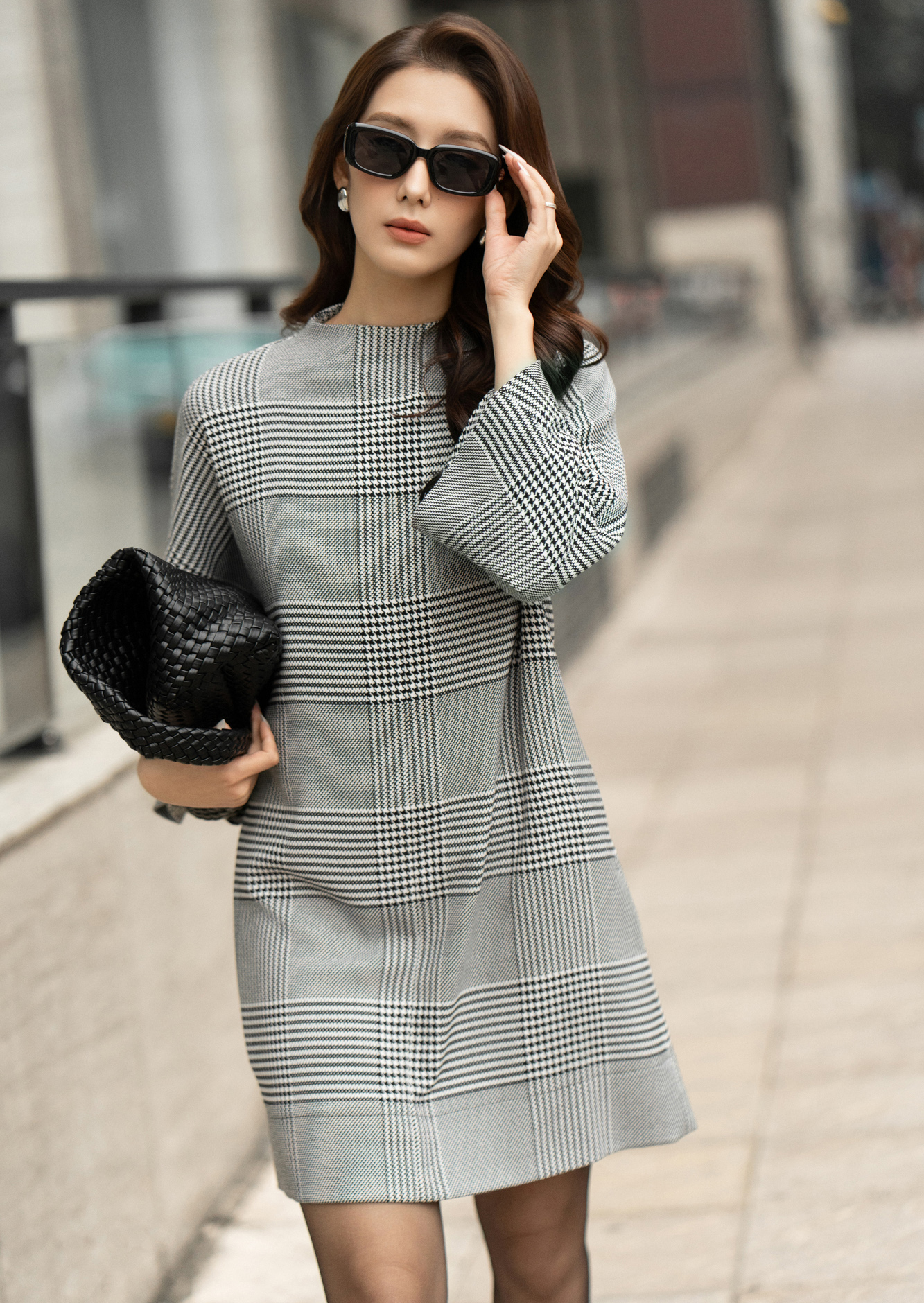 Thiết kế dáng suông dài trên nền chất liệu thô, gam màu xám dệt họa tiết kẻ là điểm nhấn nổi bật cho tủ đồ đông. Trang phục phom dáng rộng rãi, tay chuông nhẹ nhàng vừa giữ ấm vừa tạo nên sự phóng khoáng, thời thượng và dễ ứng dụng. ẢNH: XAXA