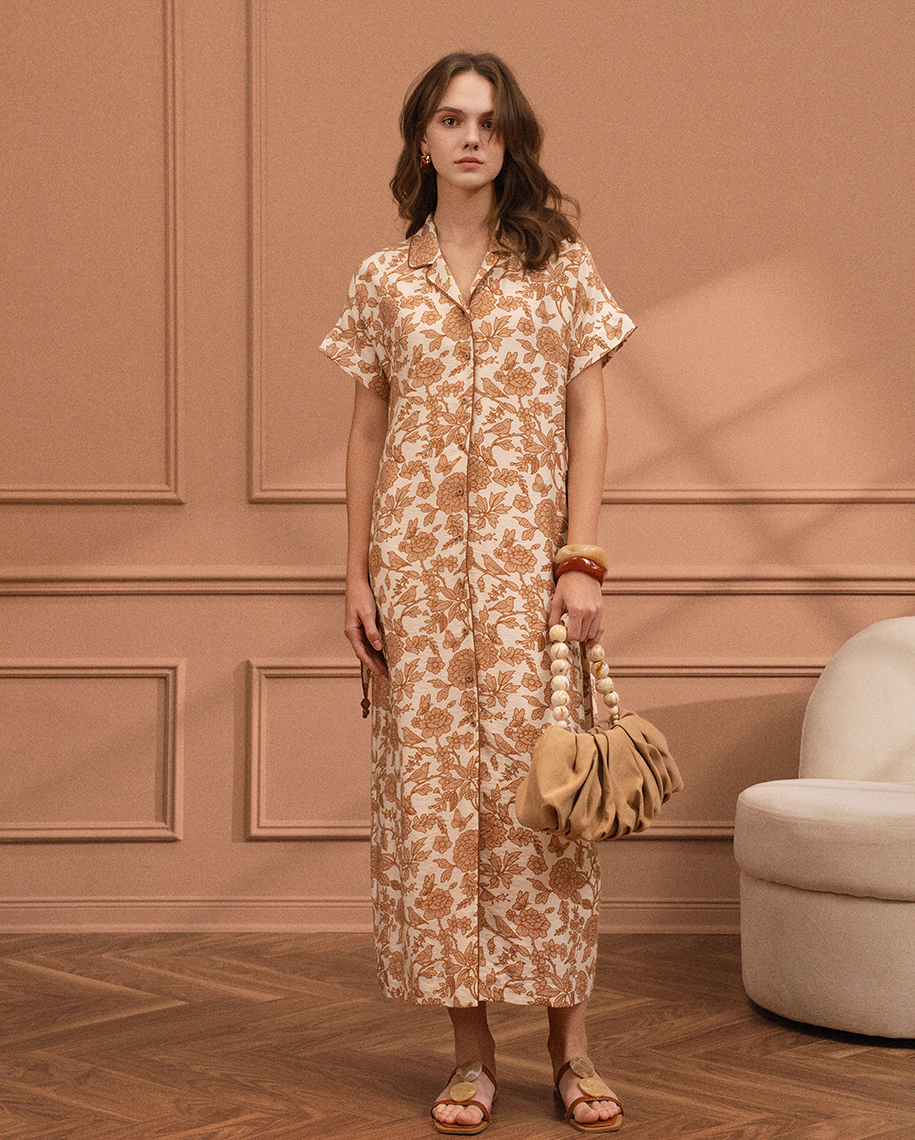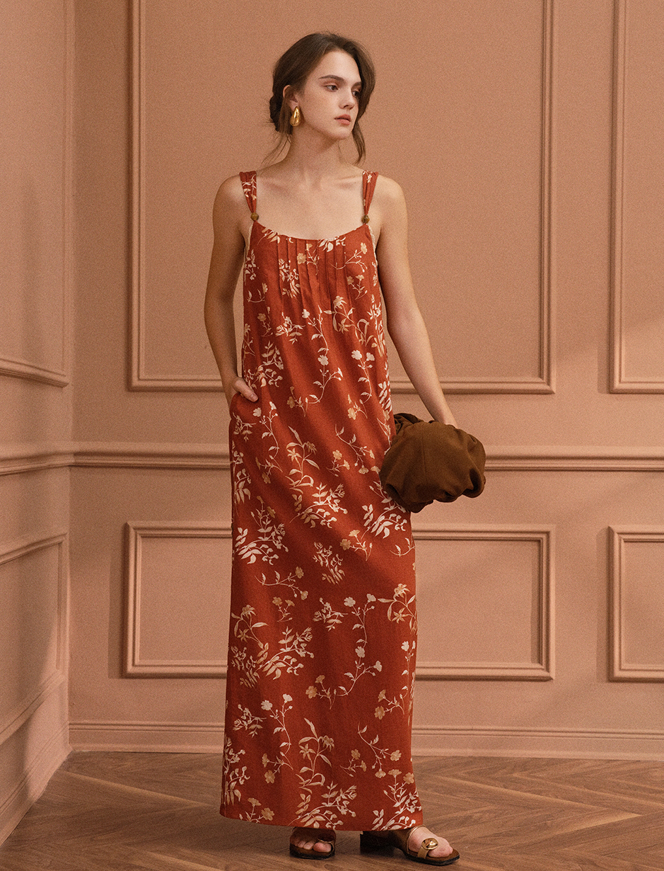 Đầm maxi vải cotton in hoa mang đến hình ảnh quý cô thư nhàn, thong dong không vội vã. Thiết kế tối giản khéo léo kết hợp các chi tiết thủ công như xếp ly, các khuy nút từ chất liệu thô mộc hòa quyện trên gam màu nâu cam ấm áp và giàu sức sống. ẢNH: RUE DES CHATS