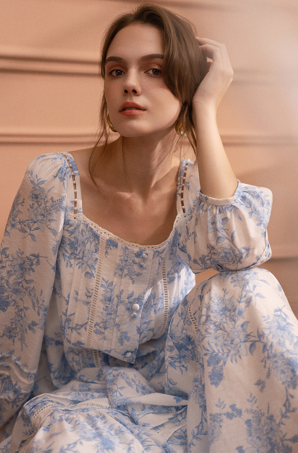 Sắc xanh blue được biến hóa để trở nên khác biệt và mới lạ qua những bản in họa tiết đặc sắc dành cho mùa đông 2025. Đầm suông họa tiết vừa là trang phục để đi làm, vừa có thể trở thành đầm tiệc hay trang phục cho những kỳ nghỉ dưỡng. ẢNH: RUE DES CHATS