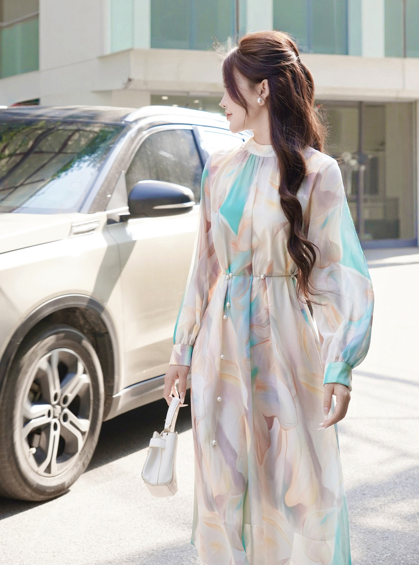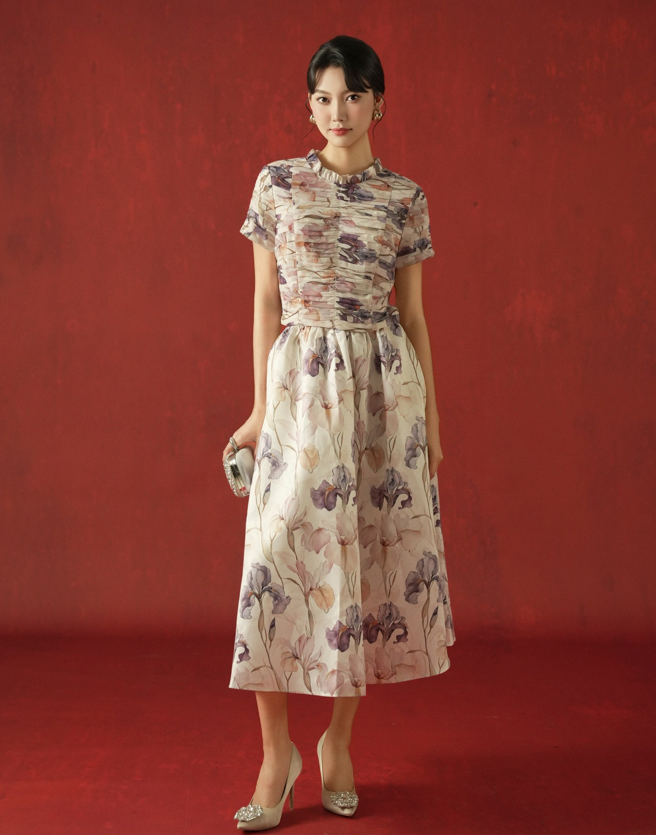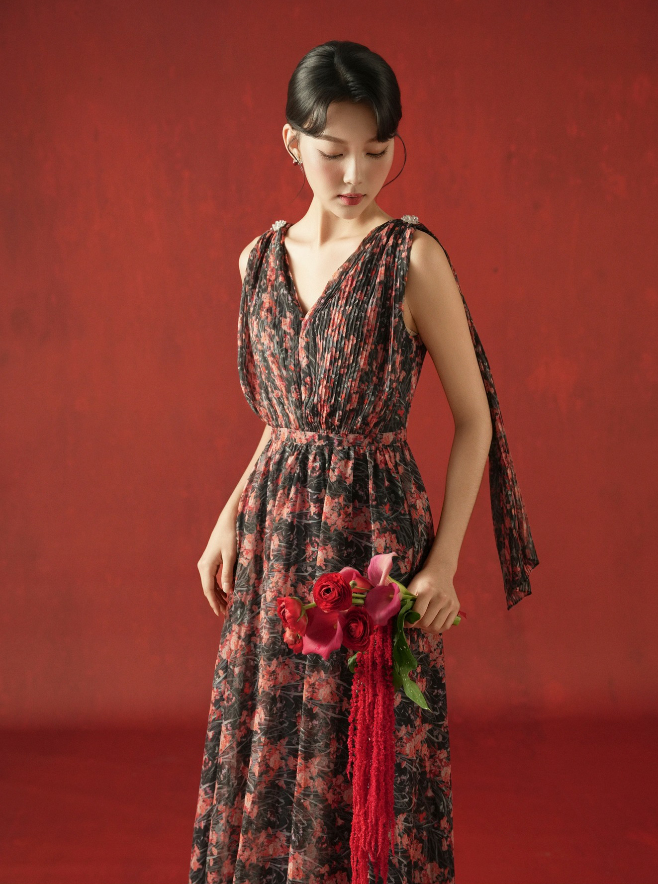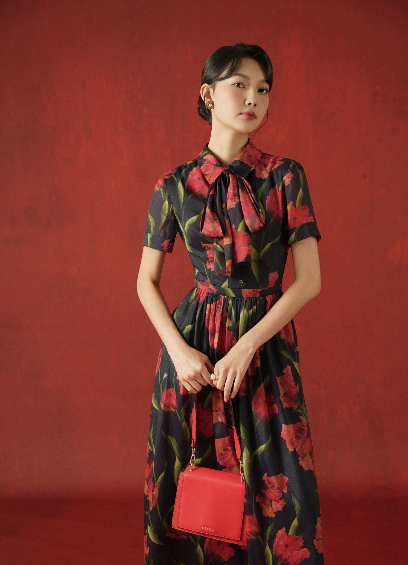 Họa tiết hoa lá là một trong số những nét đặc sắc riêng từ tủ đồ mùa xuân hè. Quý cô có thể ứng dụng mẫu váy voan hoa thắt nơ cổ cho phong cách văn phòng hoặc lên đồ dự tiệc nhẹ, tiệc trà chiều qua bản phối với túi thời trang tông màu đỏ nổi bật. ẢNH: ELISE