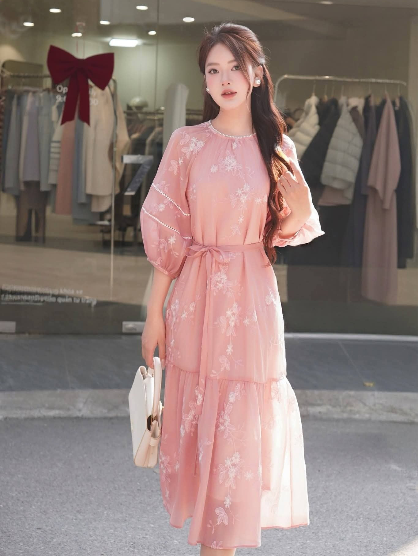 Vải lụa, tơ thêu hoa nhỏ rải rác tô đậm vẻ đẹp tiểu thư kiêu kỳ cho nàng. Sắc hồng cam tôn da kết hợp các đường viền đăng ten duyên dáng đi cùng dây vải tôn eo nhẹ nhàng, tinh tế. ẢNH: ANN DAN