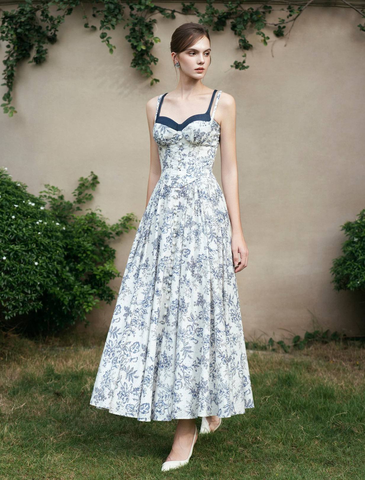Đầm hai dây dáng maxi phối hai gam màu cùng nàng đón đầu xu hướng khoe nội y. Thiết kế để mở khả năng kết hợp qua việc ứng dụng cấu trúc corset siết eo thon, tùng váy xòe xếp nếp thướt tha và sự hòa quyện của họa tiết nét mảnh trên nền vải trắng. ẢNH: DETHEIA