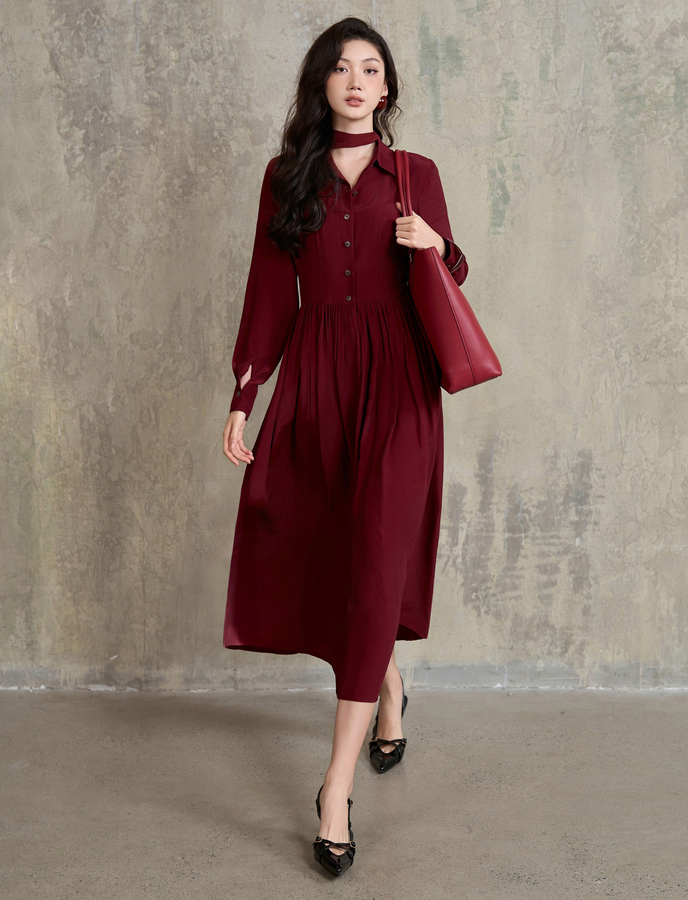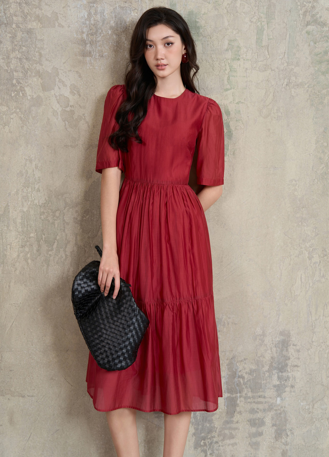 Kỹ thuật cao cấp, tinh tế góp phần không nhỏ trong việc mang đến các thiết kế nhẹ nhàng, thoạt nhìn đơn giản nhưng lại có khả năng tôn dáng một cách tài tình. Đầm liền màu đỏ rượu gây ấn tượng qua phom dáng suông nhẹ nhưng vẫn có điểm nhấn từ các đường nhún nơi eo. ẢNH: KENOSHO