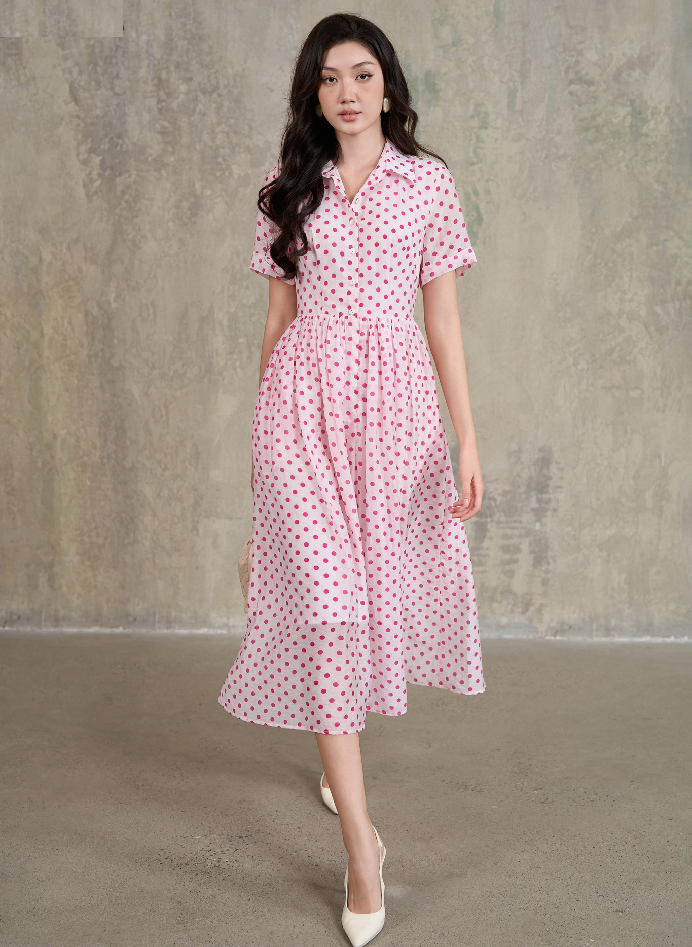 Làm mới chiếc váy sơ mi quen thuộc qua bảng màu chấm bi hồng tươi sáng giàu chất lãng mạn. Thiết kế hai lớp đảm bảo cho người mặc luôn cảm thấy dễ chịu, mát mẻ đồng thời cảm nhận được độ bay của trang phục, dáng đi uyển chuyển và nhịp nhàng. ẢNH: KENOSHO