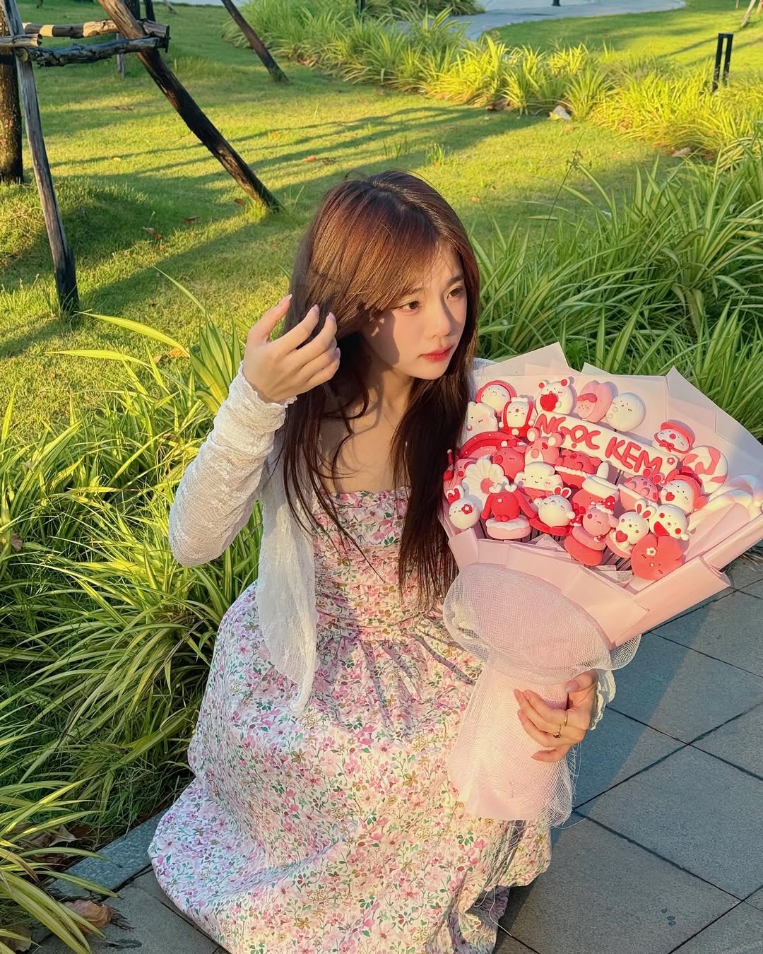 Chiếc đầm hoa nhí ngọt ngào với sắc hồng chủ đạo, từng bông hoa nhỏ li ti in trên nền vải mềm mại, phối màu pastel nhẹ nhàng, ôm vừa vặn thân hình nhưng vẫn tạo độ bay bổng cho mỗi bước chân. Khi kết hợp cùng áo khoác mỏng ren trắng và giày búp bê nhã nhặn toát lên vẻ thanh thoát. ẢNH: @NGOCKEM_