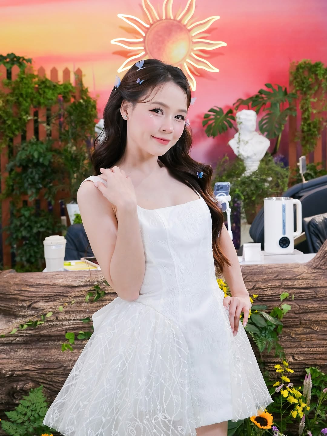 Phong cách thời trang lãng mạn không thể trọn vẹn nếu thiếu đi những món phụ kiện tinh xảo. Kẹp tóc hình cánh bướm xanh dịu được cài nhẹ trên mái tóc, kết hợp cùng váy trắng đính ren hoa cầu kỳ, tạo nên điểm nhấn sinh động như đàn bướm đang đậu giữa làn mây. ẢNH: @SAM.NG_OFFICIAL