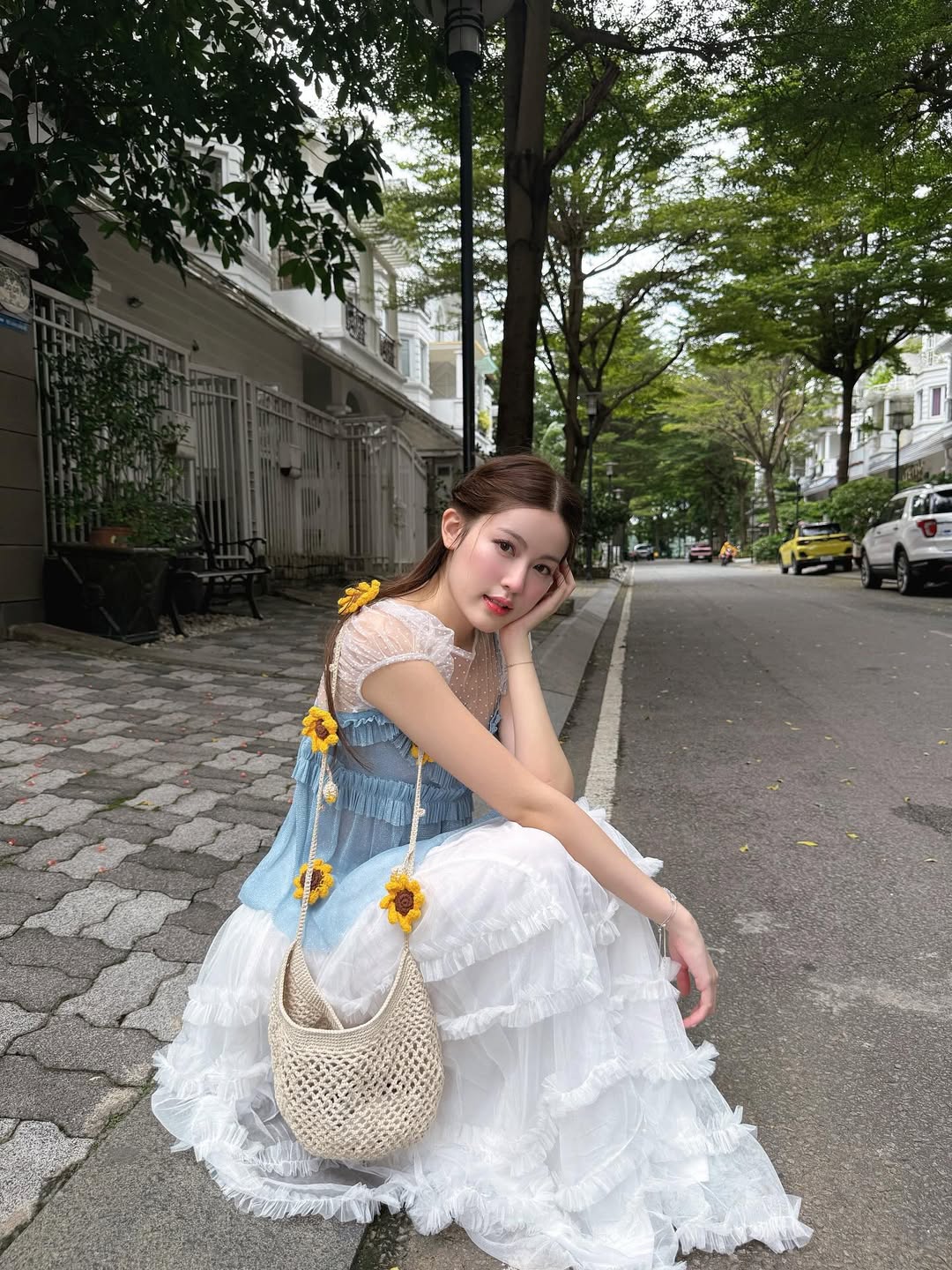 Chiếc túi xách đan móc màu kem điểm xuyết hoa hướng dương vàng chạy dọc dây đeo, vừa sinh động vừa duyên dáng. Phối cùng áo lưới xanh và chân váy trắng bồng xếp tầng, tổng thể trang phục giúp nàng như bước ra từ khu vườn cổ tích. Chất liệu len tự nhiên kết hợp trang phục nhiều lớp tạo chiều sâu cho tổng thể. ẢNH: @KJMBAE