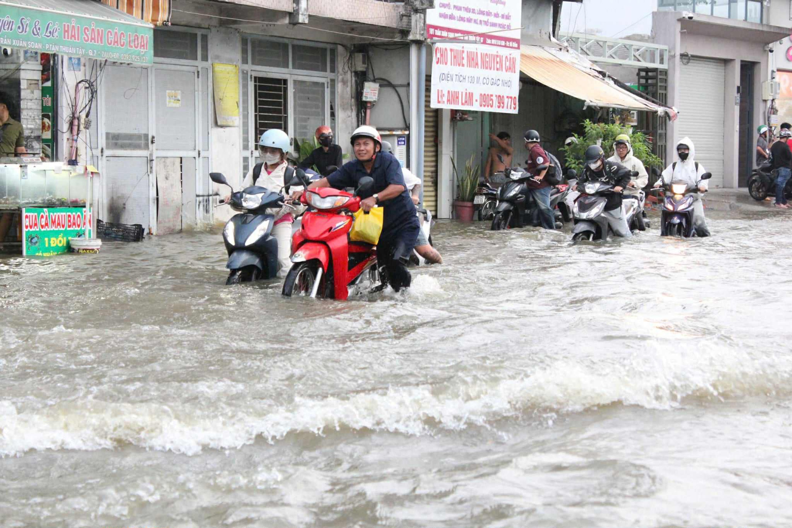 Chiều 23-10, nước triều dâng cao khiến nhiều tuyến đường tại TP.HCM bị ngập sâu, có nơi nước vượt quá nửa bánh xe máy. Tại khu vực Thanh Đa, phường Bình Quới, nước tràn từ cống lên các đường đi lại. Nhiều bãi xe ở nơi thấp phải huy động người đẩy xe ra khỏi hầm để ngăn nước tràn vào gây hư xe. Còn đường Trần Xuân Soạn "đến hẹn lại lên", nước dâng cao từ kênh Tẻ vào khiến cuộc sống người dân đảo lộn.