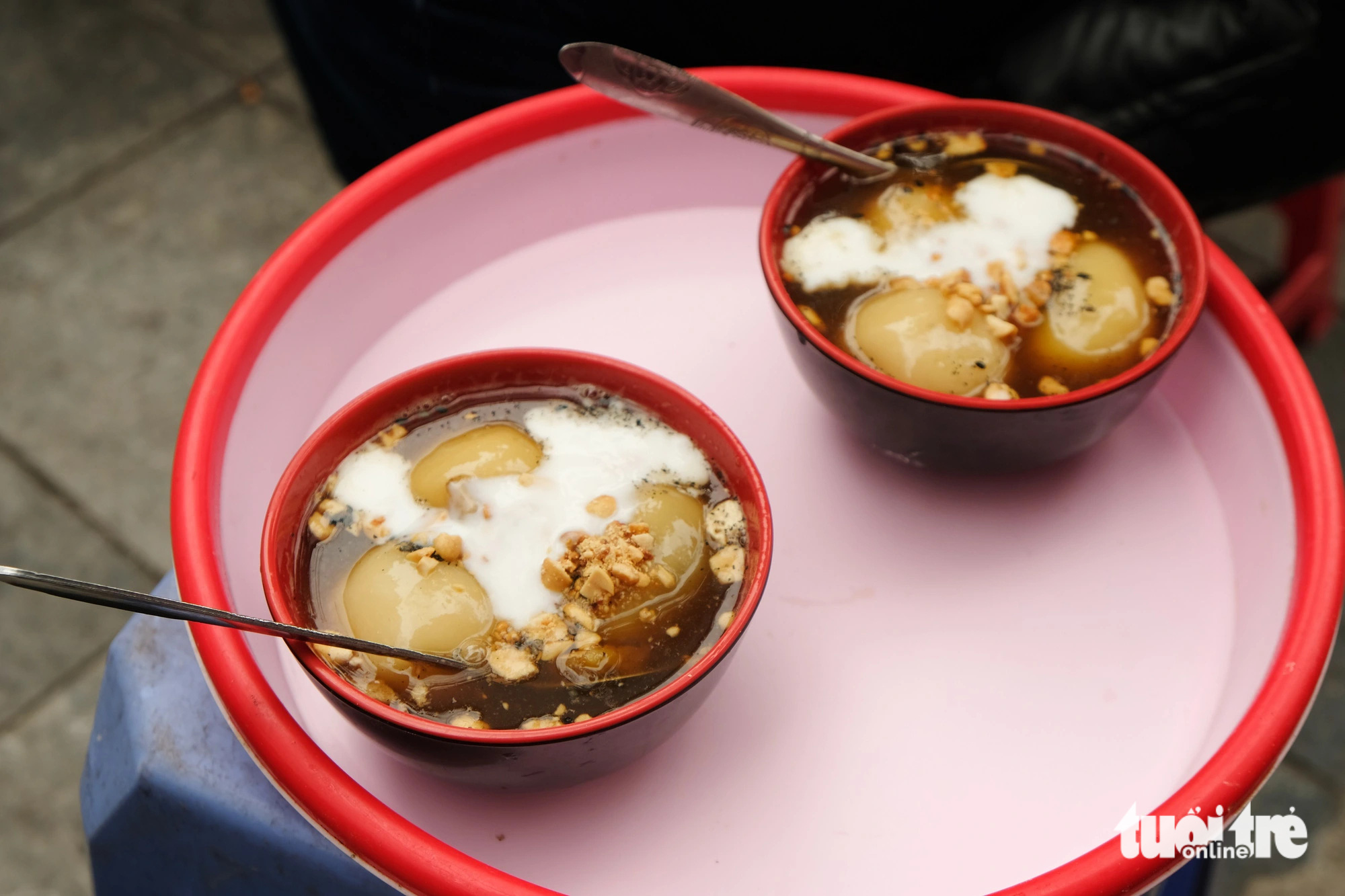 Bánh trôi tàu thường có 2-3 viên tùy quán, phổ biến nhất vẫn là hai loại nhân đậu xanh và vừng đen, chan thêm nước đường phên, gừng và lạc giã cộng nước cốt dừa hoặc dừa tươi nạo sợi - Ảnh: ĐẬU DUNG