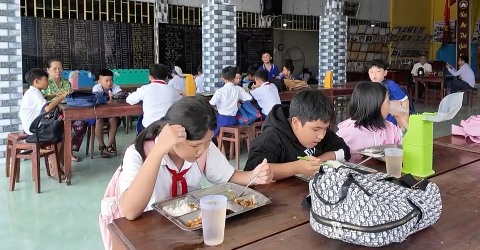 Các học sinh dùng cơm tại Nhà ăn Tình thương xã Vĩnh Trạch.