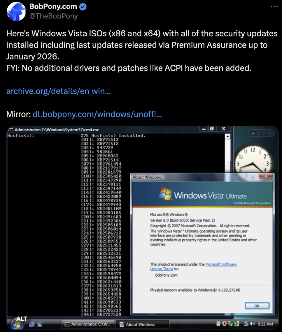 Các bản ISO được chia sẻ đã tích hợp nhiều bản vá quan trọng nhất có thể, ví dụ như Windows Vista đã được cập nhật bản vá bảo mật đến tháng 1.2026 thông qua chương trình Premium Assurance Updates, giúp quá trình cài đặt trở nên thuận tiện hơn so với việc tìm kiếm từng bản cập nhật riêng lẻ như trước đây. Tuy vậy các bản vá này không đồng nghĩa với việc hệ điều hành an toàn như Windows hiện đại.