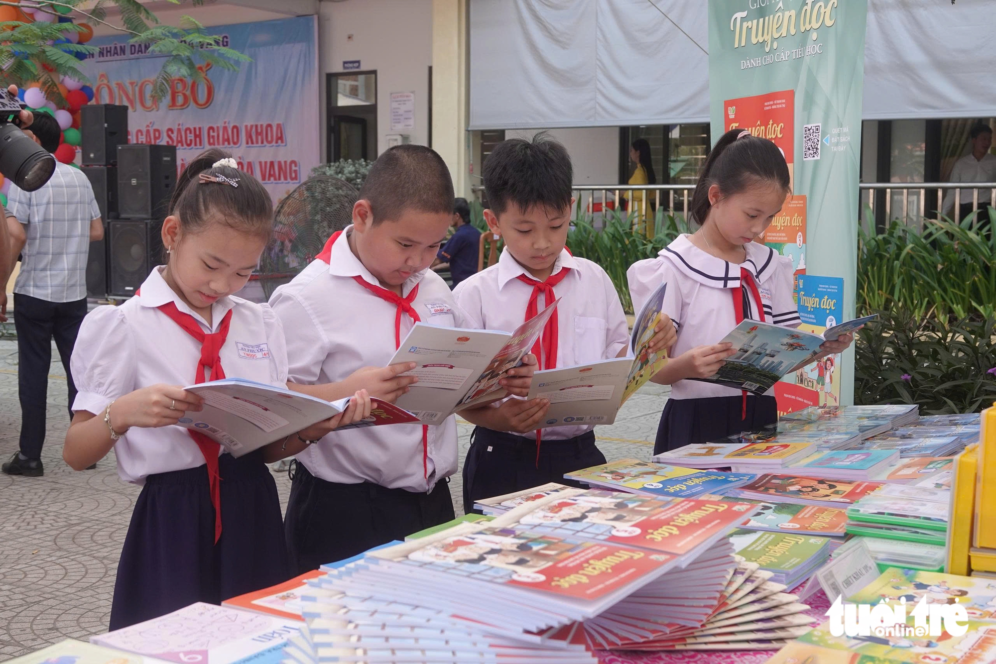 Phó chủ tịch UBND thành phố Trần Anh Tuấn, Giám đốc Sở Giáo dục và Đào tạo Lê Thị Bích Thuận, trao sách cho học sinh - Ảnh: CHÂU SA