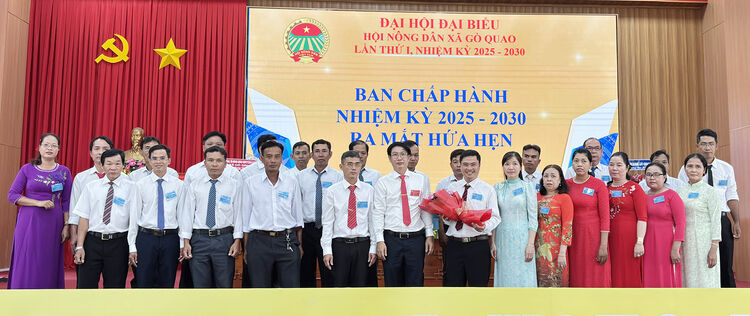 Bí thư Đảng ủy xã Gò Quao Hồ Minh Hải (hàng đầu, thứ sáu từ trái qua) tặng hoa chúc mừng Ban Chấp hành Hội Nông dân xã Gò Quao nhiệm kỳ 2025 - 2030.