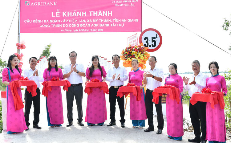 Đảng ủy, UBND xã Mỹ Thuận và Ngân hàng Agribank chi nhánh Kiên Giang cắt băng khánh thành cầu kênh Ba Ngàn.