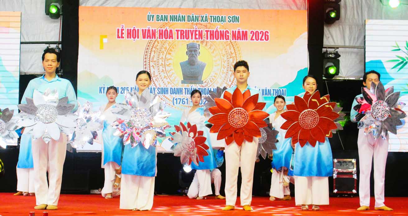 Mở đầu buổi lễ là chương trình nghệ thuật với chủ đề “Thoại Sơn - Dòng chảy di sản, dấu ấn tiền nhân, khát vọng phát triển”. Bằng hình thức sân khấu hóa, chương trình đã tái hiện sinh động lịch sử hào hùng của vùng đất Thoại Sơn, từ nền văn hóa Óc Eo rực rỡ đến công cuộc khai phá, lập làng của các bậc tiền nhân.