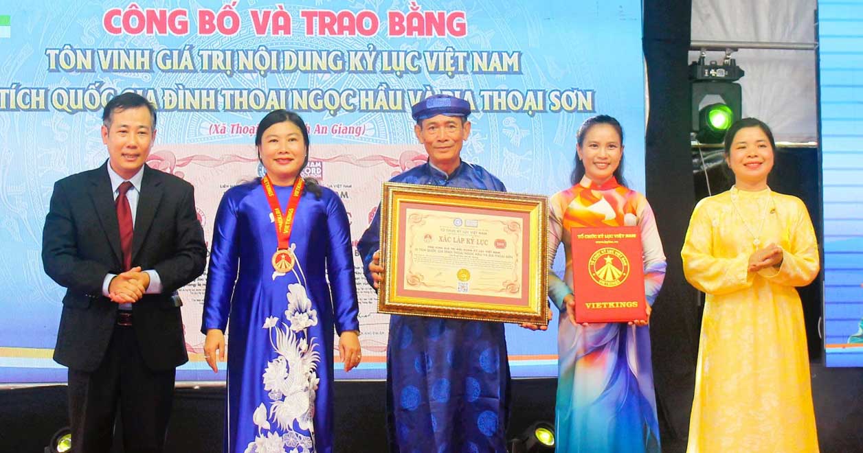 Tổ chức Kỷ lục Việt Nam VietKings trao bằng tôn vinh giá trị nội dung kỷ lục cho di tích quốc gia đình Thoại Ngọc Hầu và bia Thoại Sơn gắn với lịch sử dòng kênh Thoại Hà.