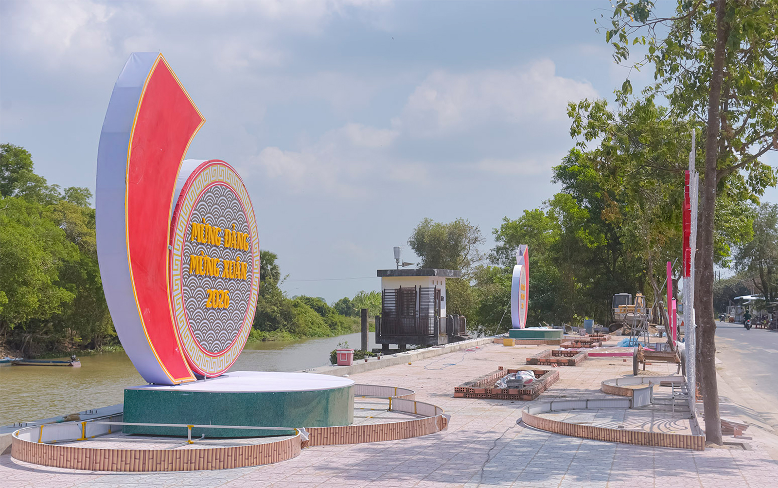 Các tiểu cảnh tại khuôn viên bờ kè trước UBND xã Vĩnh Điều đang được trang trí đón Tết.