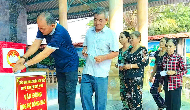 Cán bộ, công chức, viên chức và người dân xã Vĩnh Thạnh Trung đóng góp hỗ trợ đồng bào miền Bắc bị thiên tai, bão lũ.